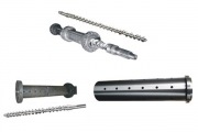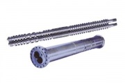 機(jī)筒和螺桿具有塑化混煉均勻、產(chǎn)量高、質(zhì)量穩(wěn)定、適應(yīng)范圍廣、使用壽命長等特點。其兩端直徑不同,加料段直徑大,均化段直徑小,中間逐漸過渡。兩根錐形螺桿在機(jī)筒中互相嚙合、異向旋轉(zhuǎn),物料在螺紋推動下軸向前進(jìn)。